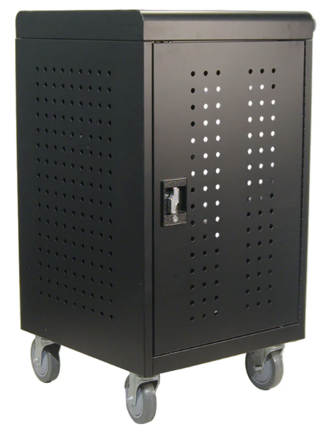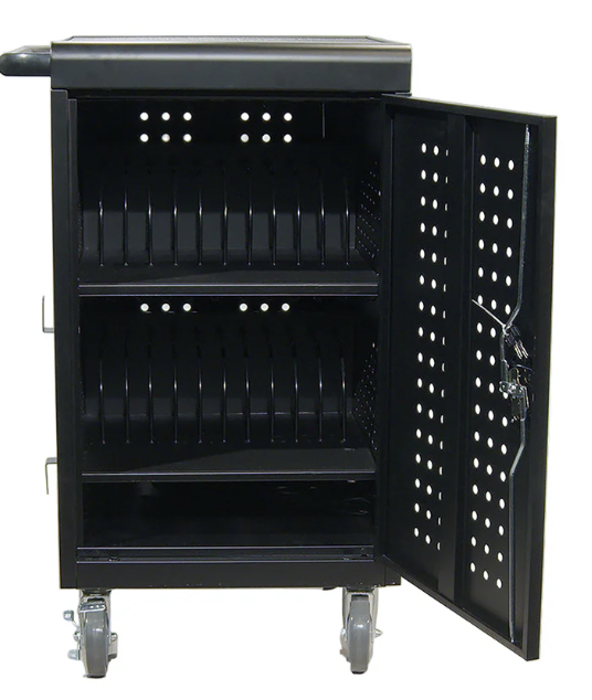 Universal laddvagn med laddning för upp till 24 enheter anpassad för Chromebooks/laptops upp till 14,2”, surfplattor eller annan mindre utrustning. Alla datorer har eget fack, stående (vertikalt) med egen laddning.