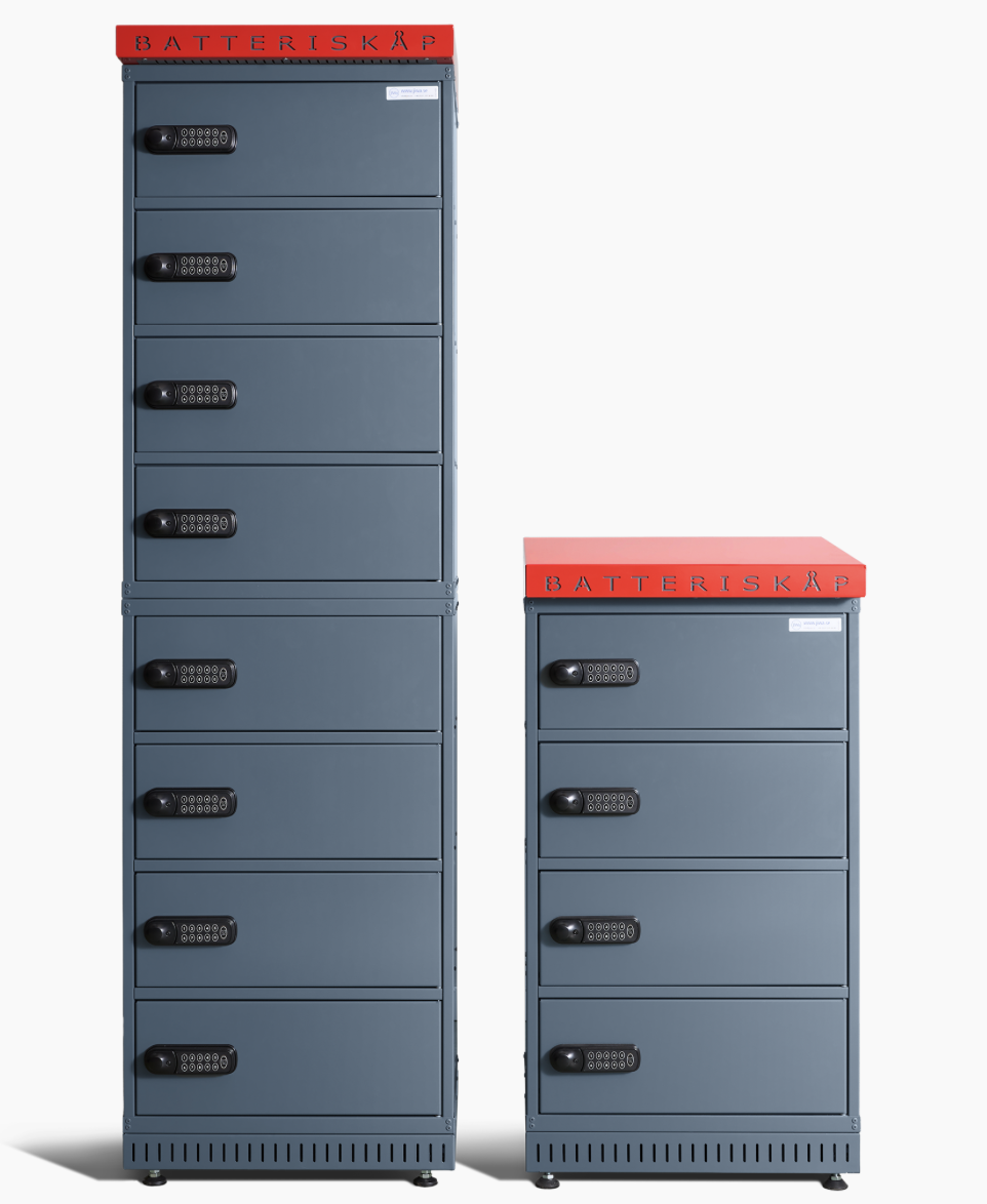 Batteriskåpets fack är rymliga och har god genomgående ventilation. Varje fack är utrustat med IP-klassat jordat uttag och individuellt kodlås (IP65) för enkel och trygg laddning. Laddskåpet är dimensionerat för 16A och är utrustat med 16A säkring, vilket möjliggör stabil drift av alla laddplatser samtidigt. Finns med fyra eller åtta fack och kan anpassas efter era behov, exempelvis med RFID-låsning. Laddskåpen levereras med 3 meter lång elkabel med stickkontakt, kabeln dras in baktill genom golvsockeln eller underifrån. Ett praktiskt val för dig som vill erbjuda utomhusförvaring och laddning av elcykelbatterier, minska brandrisker inomhus och samtidigt stärka ert systematiska brandskyddsarbete (SBA).