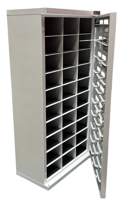 Här har du ett mobilförvaringsskåp som är både säkert och praktiskt. Skåpet är konstruerat och tillverkat så att man snabbt och enkelt deponerar sin mobil vilket gör att skåpet passar utmärkt på tex skolor där man har mobilförbud i klassrummen. Detta praktiska Mobilhotell passar även utmärkt på kontor för att tex skapa mobilfria zoner för att bidra till effektivare möten eller en lugnare arbetsmiljö. Man ser in i varje fack så att man kan kontrollera att mobilen är inlämnad och i vilket fack den förvaras. Varje fack är dessutom utrustat med fiskningsskydd samt en matta på golvet i varje fack för att minimera skaderisken. Dörren som ger tillgång till samtliga fack kan utrustas med nyckel- eller kodlås.