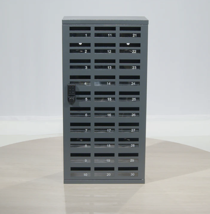 Här har du ett mobilförvaringsskåp som är både säkert och praktiskt. Skåpet är konstruerat och tillverkat så att man snabbt och enkelt deponerar sin mobil vilket gör att skåpet passar utmärkt på tex skolor där man har mobilförbud i klassrummen. Detta praktiska Mobilhotell passar även utmärkt på kontor för att tex skapa mobilfria zoner för att bidra till effektivare möten eller en lugnare arbetsmiljö. Man ser in i varje fack så att man kan kontrollera att mobilen är inlämnad och i vilket fack den förvaras. Varje fack är dessutom utrustat med fiskningsskydd samt en matta på golvet i varje fack för att minimera skaderisken. Dörren som ger tillgång till samtliga fack kan utrustas med nyckel- eller kodlås.